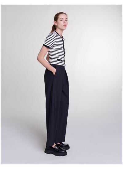 Ce pantalon large Maje est-il adapté à toutes les morphologies ? Ce modèle est conçu pour offrir une silhouette élégante et fluide, sa coupe large convient particulièrement aux morphologies en quête de confort et de style, tout en affinant la taille grâce à sa ceinture intégrée.