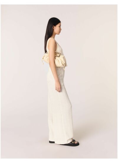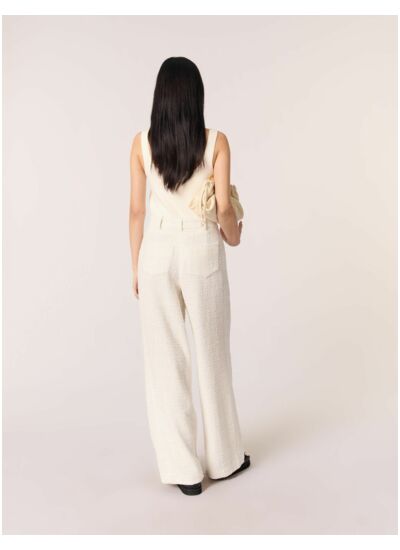 Confectionné dans un tweed écru aux fils scintillants, ce pantalon présente une coupe large et flatteuse. Des plis creux allongent la jambe et apportent une fluidité à la silhouette. Les deux poches côtés et au dos, discrètes et pratiques, viennent parfaire cette pièce lumineuse.