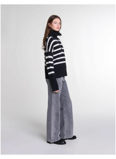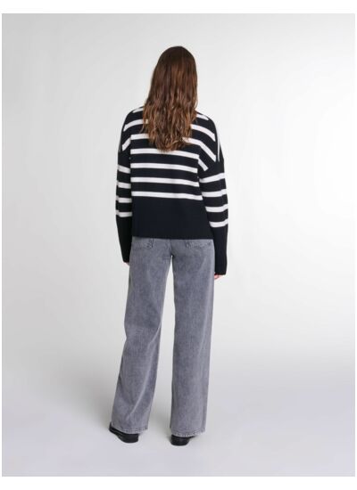 Ce pull convient-il à un style casual ou plus habillé ? Son imprimé rayures et son col montant apportent une touche moderne qui s’adapte aussi bien à un look décontracté qu’à une tenue plus soignée. Il se marie facilement avec un jean pour un style casual ou un pantalon chic pour un rendu élégant.