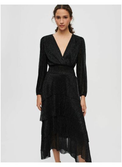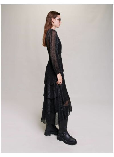 Quels accessoires mettre avec cette robe pour sublimer son style ? Optez pour des accessoires minimalistes et élégants, comme des escarpins sobres et une pochette fine, afin de laisser la texture lamé et les volants s’exprimer pleinement.