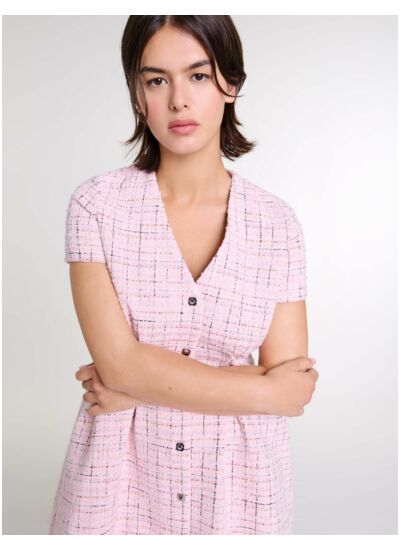 De quel tissu est composée cette robe ? Cette robe est confectionnée en tweed, un tissu texturé et structuré qui assure une tenue élégante et durable, idéale pour un look sophistiqué en toute saison.