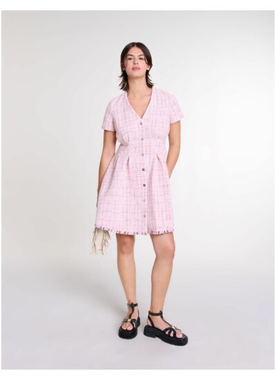 Munie d'un col V, de manches courtes et d'une fermeture à boutons pression, cette robe courte effet tweed illumine instantanément votre allure. Marquée d'une taille ajustée à plis creux, elle révèle une jupe évasée, réhaussée de bords frangés.