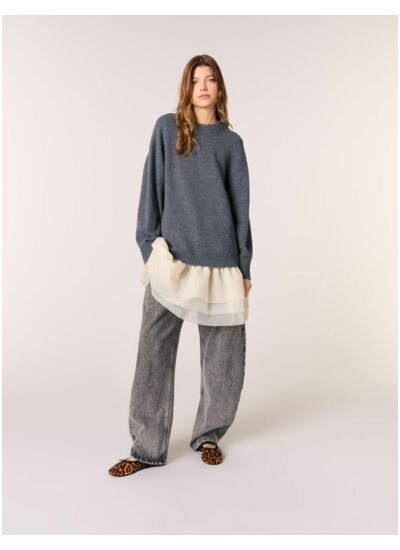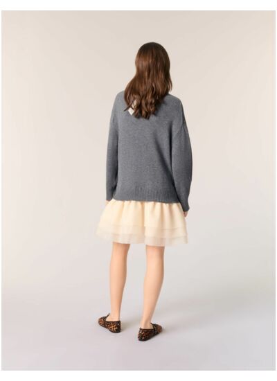 Effet 2-en-1, cette robe courte allie la chaleur de la maille à la légèreté de l'organza. Un pull long et minimaliste laisse place à une jupe volumineuse à pans volantés, créant un joli jeu de volumes. Une ouverture et un nœud au dos ajoutent une note audacieuse, tandis que des bords côtelés structurent la silhouette.