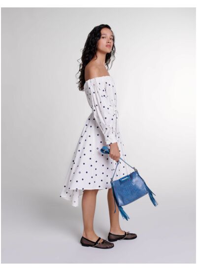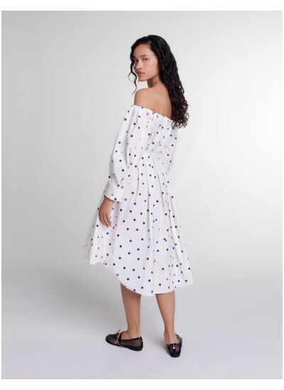 Ornée d'un imprimé pois et Clover, cette robe longueur midi en popeline séduit par son allure audacieuse. Son encolure élastiquée offre la possibilité de porter les épaules plus ou moins dénudées. Munie de poignets resserrés à boutons bijoux, elle se noue à la taille d'une ceinture amovible, et offre une jupe évasée.