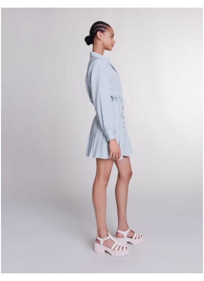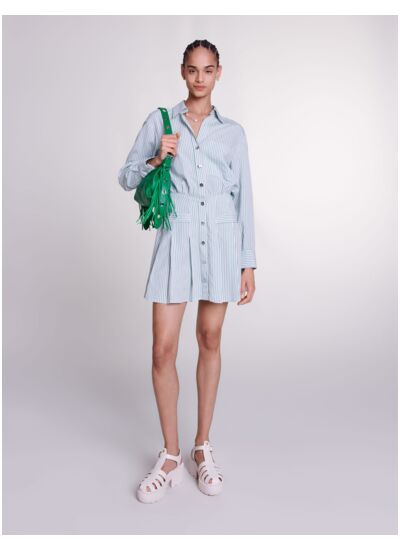 Quelle est la matière de la robe chemise à rayures Maje MFPRO03582 ? Cette robe est conçue dans un tissu de qualité, alliant confort et tenue, idéal pour un style élégant et décontracté.