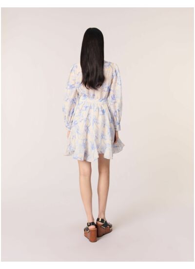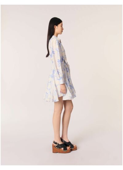Un imprimé bleu pivoine effet aquarelle s'invite sur cette robe chemise courte, confectionnée à partir de lin léger. Nouée d'une ceinture à la taille, elle dévoile une jupe évasée et volantée offrant un joli jeu de volume. Une fermeture et des poignets boutonnés ajoutent une touche structurée à cette pièce légère et élégante.