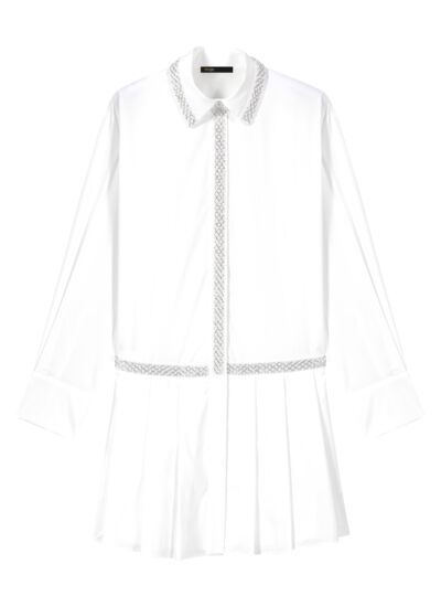 Munie de manches longues et de deux poches, cette robe chemise courte incarne l'élégance sans effort. Des galons ornés de perles et de sequins soulignent le col et la patte de boutonnage. Chic et structurée, elle dessine une jupe délicatement plissée pour une allure fluide et gracieuse.