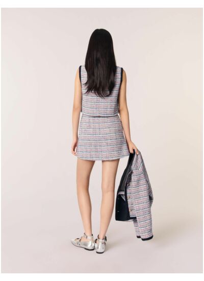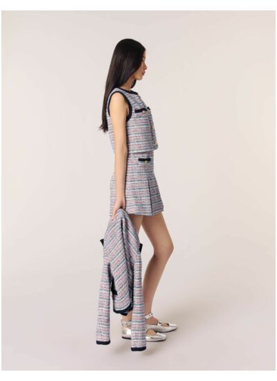 Pièce signature du studio, cette robe courte 2-en-1 en tweed fantaisie crée un effet trompe-l’œil. Son top sans manches amovible offre plusieurs portés : en total look avec la jupe coordonnée à plis creux, ou avec un jean décontracté. Des bords tressés, des poches plaquées et des boutons décoratifs apportent un jeu de contrastes.