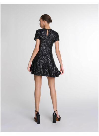 Brillez de mille feux avec cette robe courte et doublée, ornée de sequins en all-over. Un col rond, des manches courtes et une fermeture goutte boutonnée au dos créent une silhouette irrésistible, sublimée par une jupe évasée.