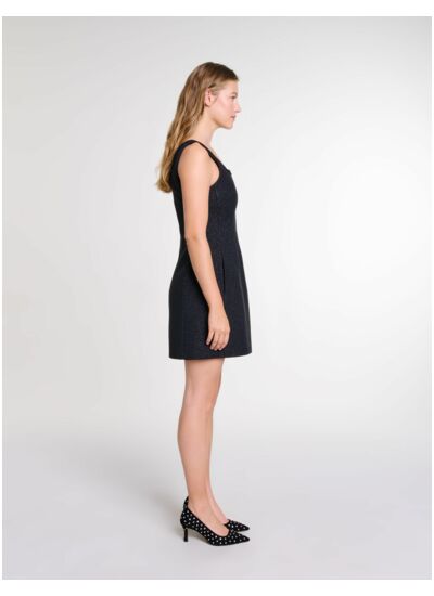 Élégante et intemporelle, cette robe courte sans manches révèle un décolleté carré bordé de strass scintillants. Dotée de bretelles larges et de deux poches, elle flatte la silhouette avec un tombé légèrement évasé.