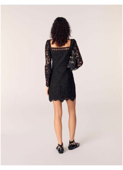 Quelles sont les caractéristiques principales de la robe MFPRO03927 ? Cette robe courte en guipure signée Maje se distingue par son tissu délicat et travaillé, offrant une texture raffinée et un rendu élégant, idéal pour des occasions où vous souhaitez allier féminité et modernité.