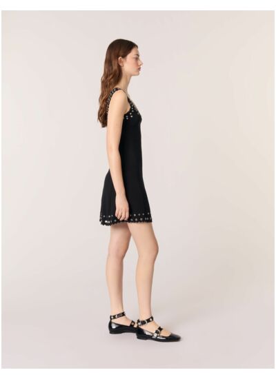 Confectionnée en maille stretch, cette robe courte sublime la silhouette avec son décolleté arrondi et sa jupe évasée. Un jeu de rivets argentés et perforés illuminent les bords délicatement festonnés.