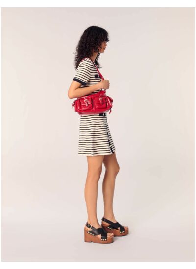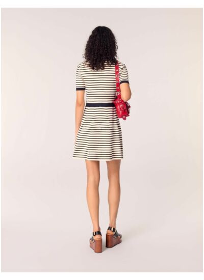 Cette robe courte est confectionnée en maille côtelée à rayures esprit marinière. Des bandes contrastées soulignent sa coupe ajustée, tandis que la jupe offre un tombé évasé. Une fermeture boutonnée et quatre poches complètent cette pièce sophistiquée.