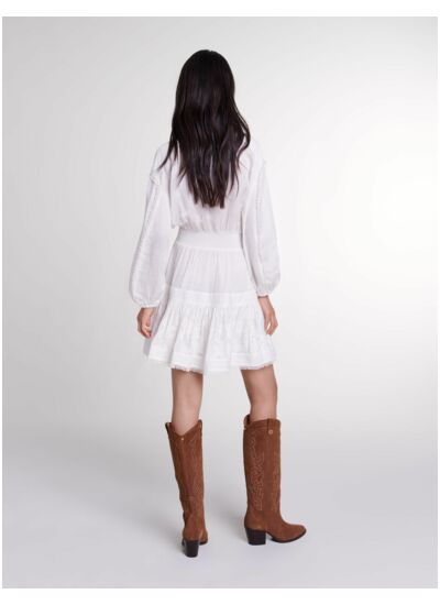 Munie de liserés plissés et de galons aux épaules, cette robe courte est ornée de plumetis et de dentelle. Un col chemise boutonné, des manches longues et des poignets resserrés viennent structurer élégamment l'allure. Ajustée à la taille par une bande smockée, elle dévoile une jupe doublée au tombé évasé qui flatte toutes les silhouettes. Complétez votre look de saison avec des bottes western et un sac signature.