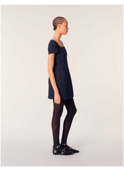 Confectionnée en tweed scintillant, cette robe courte est structurée par une encolure carrée, des manches courtes et une taille ajustée. Sa jupe évasée, complétée par deux poches, équilibre les volumes.