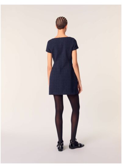 Avec quels accessoires associer cette robe courte en tweed ? Elle se marie parfaitement avec des escarpins ou des bottines élégantes et un sac structuré pour un look chic et contemporain.