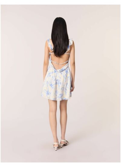 Un imprimé bleu pivoine s'invite sur cette robe courte et satinée, dévoilant une silhouette romantique. Des coques offrent un décolleté naturellement mis en valeur, et des bretelles froncées laissent apparaître le dos.