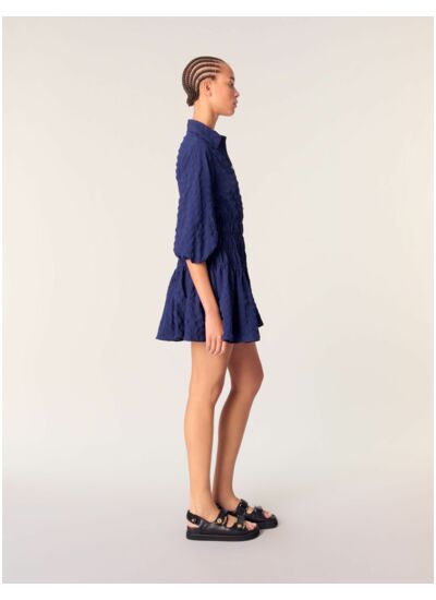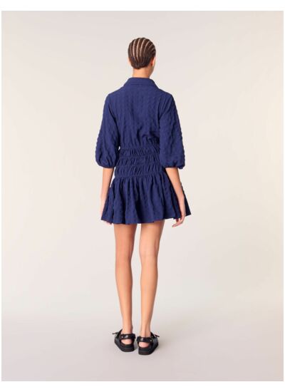 Cette robe courte est confectionnée dans une matière texturée, créant un effet gaufré. Les manches courtes élastiquées et la taille smockée soulignent la silhouette, tandis que la jupe plissée et évasée apporte de la fluidité. Elle s'agrémente d'une fermeture à boutons métalliques Clover.