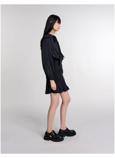 Une allure fluide et sophistiquée pour cette robe courte twistée d'un jeu de matières. Composée d'une chemise satinée boutonnée à manches longues, elle dévoile des épaules smockées et un col lavallière à nouer au gré de vos envies. Ajustée à la taille, la jupe smockée offre un tombé volanté qui insuffle audace et légèreté à votre silhouette.