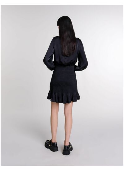 Quelles sont les caractéristiques principales de la robe courte smockée Maje ? Cette robe se distingue par sa coupe courte et son tissu smocké qui épouse délicatement la silhouette. Elle combine élégance et confort, idéale pour un look moderne et féminin.