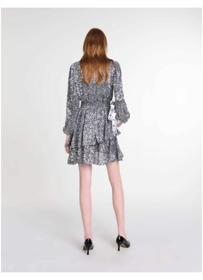 Parée de sequins argentés en all-over, cette robe courte révèle un décolleté en V irrésistible. Ses manches longues et sa jupe volantée, soulignée par une taille smockée, créent une silhouette aérienne des plus élégantes.
