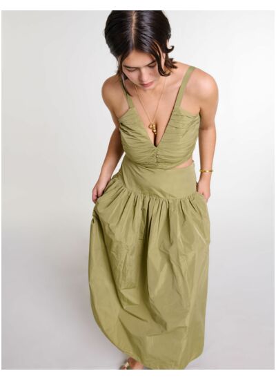 Confectionnée en matière technique façon taffetas, cette robe longue séduit par son décolleté plongeant en V effet froncé, encadré de bretelles larges. Délicatement smockée au dos, elle révèle un jeu de découpes audacieuses à la taille, révélant subtilement la peau, et une jupe aérienne et volumineuse.