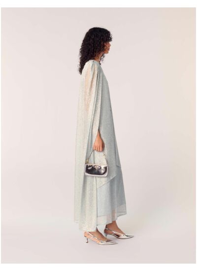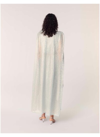 Ornée de motifs dorés, cette robe longue et doublée offre un subtil jeu de transparence. Une cape amovible, intégrée aux épaules, apporte du volume à l’allure aérienne. Une ceinture à maillons offre un double porté : marquée à la taille ou doublée en collier.