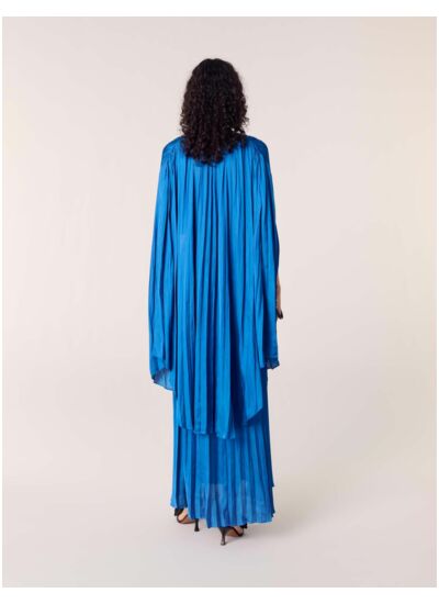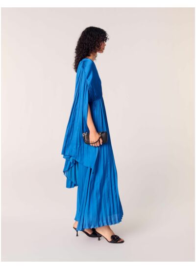 Quelles sont les caractéristiques de la coupe de cette robe ? La robe présente une coupe longue fluide avec une cape intégrée qui crée du volume et du mouvement. Le plissé satinée accentue la légèreté du tissu tout en offrant une silhouette élancée.