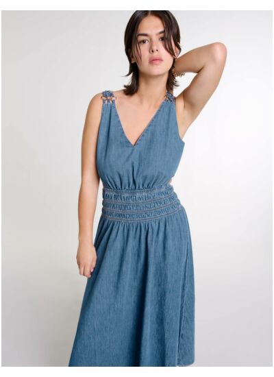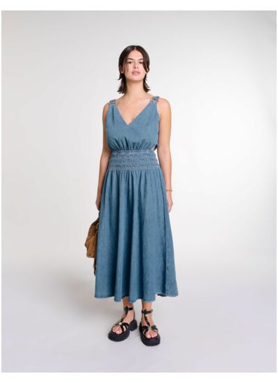Quelle est la matière principale de la robe longue ajourée en denim Maje ? Cette robe est conçue en denim de qualité, offrant à la fois robustesse et confort, avec un travail ajouré qui apporte légèreté et modernité à la pièce. Comment entretenir cette robe pour préserver son aspect et sa coupe ? Il est recommandé de laver la robe à froid en cycle délicat et de la laisser sécher à l’air libre pour conserver la texture du denim et la finesse des détails ajourés. Quelle silhouette met en valeur cette robe longue ? Sa coupe fluide et ajourée sublime toutes les morphologies en apportant une touche élégante et décontractée, idéale pour un look estival ou une sortie en journée. Cette robe convient-elle à un style casual ou plus habillé ? Polyvalente, elle s’adapte aussi bien à un look casual avec des baskets qu’à une tenue plus sophistiquée associée à des sandales à talons et des accessoires minimalistes. Quels sont les atouts distinctifs de cette robe Maje par rapport à une robe en denim classique ? Le travail ajouré unique apporte une dimension féminine et aérienne, tandis que la longueur offre une élégance naturelle, faisant de cette robe un choix original et raffiné dans la catégorie denim.