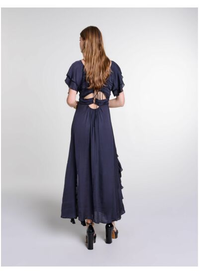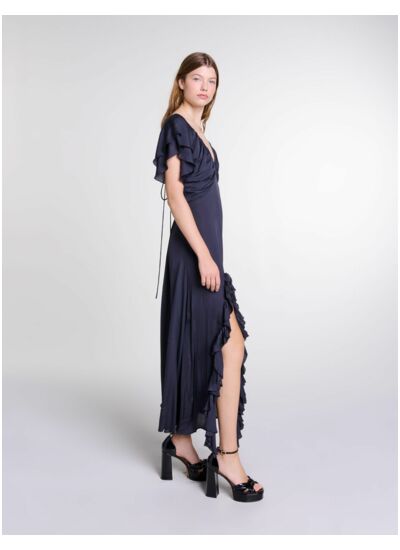 Des volumes maîtrisés et une silhouette irrésistible pour cette robe longue en satin. Les manches courtes et le décolleté plongeant en V froncé soulignent l'allure. Offrant un dos ouvert à laçage croisé, elle dévoile une jupe évasée délicatement fendue, ornée de volants travaillés.