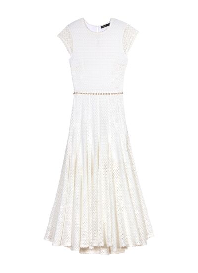 Une silhouette légère et aérienne se dévoile dans cette robe longue en matière ajourée, munie d'une doublure courte. Dotée de petites manches et d'une ceinture bijou soulignant la taille, elle affiche une jupe volumineuse et évasée.
