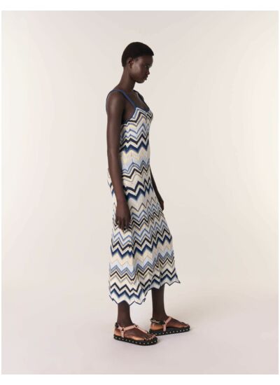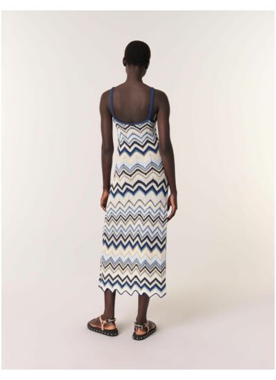 Confectionnée en maille crochet subtilement plissée, cette robe longue adopte un motif zigzag graphique. Des bretelles tressées ornent le décolleté, tandis que sa jupe festonnée, légèrement évasée, offre une allure féminine.