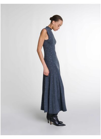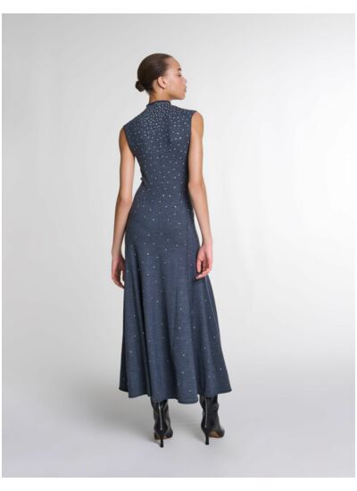 Dotée d'un col montant roulé, cette robe longue sans manches en maille se distingue par son allure cintrée et sa jupe évasée. Un jeu de strass étincelants et de plis délicats se révèlent le long de la silhouette, apportant une touche d'éclat irrésistible.
