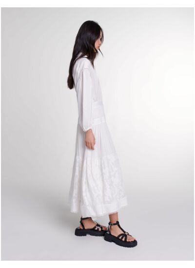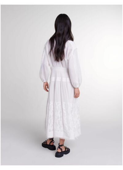 Un vent de légèreté souffle sur cette robe longue ornée de plumetis et de fleurs. Munie d'un col chemise, de manches longues, de poignets élastiqués et de galons aux épaules, elle flatte gracieusement la silhouette grâce à sa fermeture boutonnée, dévoilant une jupe doublée au tombé évasé et aérien.