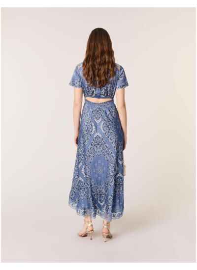 Confectionnée en satin, cette robe longue adopte l'imprimé phare de la saison, le paisley. Son décolleté en V est sublimé par des bords transparents incrustés de dentelle. Smockée et ajourée au dos, elle offre une jupe fendue légèrement volantée au bas.