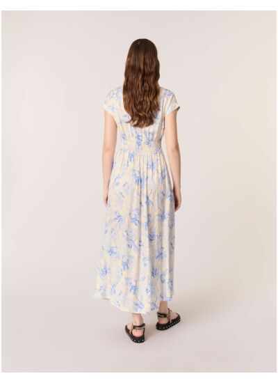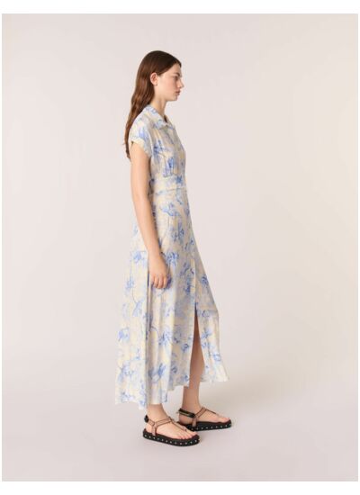 Comment entretenir la robe longue imprimée Maje ? Pour préserver la qualité des couleurs et du tissu, il est recommandé de suivre les instructions d’entretien indiquées sur l’étiquette, généralement un lavage délicat à froid ou un nettoyage à sec.