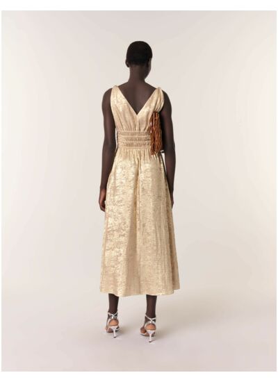 Cette robe longue adopte une matière scintillante dorée, prête à illuminer toutes vos occasions. Son décolleté en V met en valeur une jupe fluide et évasée. Sa taille smockée est sublimée par des découpes à liens et perles dorées.