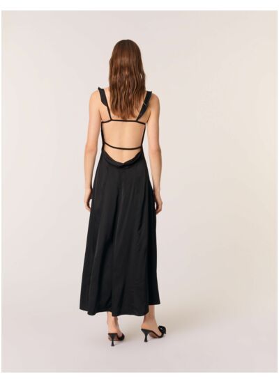 Cette robe longue attire tous les regards avec son dos nu orné de liens, et sa jupe délicateent fendue. Son décolleté en cœur et ses bretelles volantées confèrent une allure romantique et féminine.