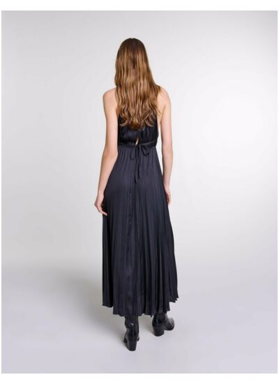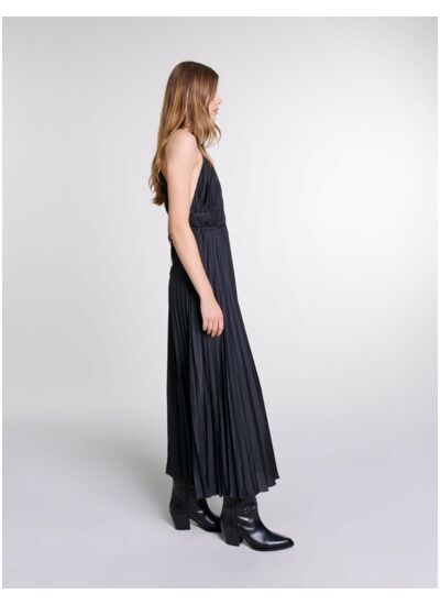 Quelle matière compose la robe longue satinée plissée Maje ? La robe est confectionnée en satin, offrant un toucher doux et une finition brillante qui valorise la silhouette avec élégance.