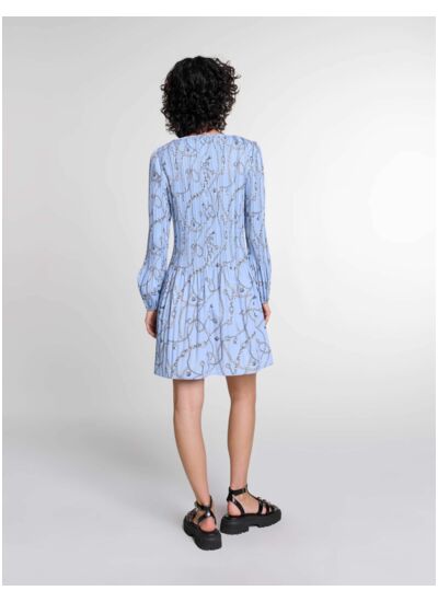 Beaucoup d'allure pour cette robe courte plissée,  ornée d'un imprimé chaîne dont les motifs porte-bonheur s'entrelacent avec élégance. Munie d'un col rond, de manches longues et de poignets resserrés, ses plis délicats insufflent une silhouette fluide et légère.