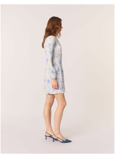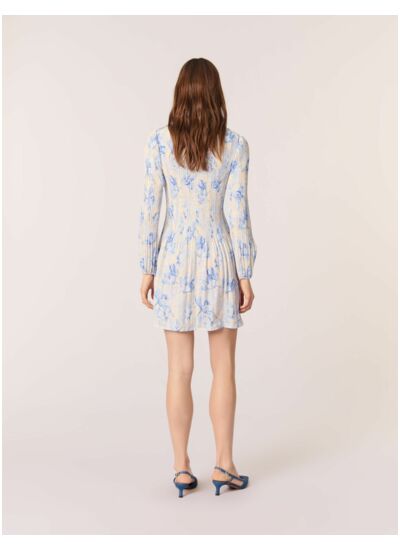 Un imprimé bleu pivoine s'invite sur cette robe courte aux accents romantiques. Son haut plissé contraste avec sa jupe lisse, créant un effet de volume.