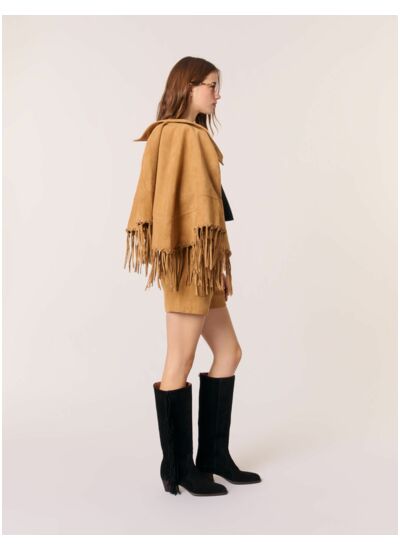Pièce coup de cœur du studio, ce short doublé en cuir suédé reprend les codes du style Western. Des franges et œillets argentés ornent les bords des deux poches, créant un effet de mouvement.