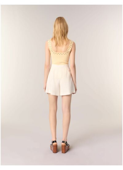 Ce short est-il adapté aux températures chaudes ? Ce short fluide est conçu pour offrir légèreté et confort, idéal pour les journées chaudes grâce à sa matière aérienne qui facilite la circulation de l’air. Comment entretenir ce short pour préserver sa qualité ? Il est recommandé de suivre les instructions de lavage indiquées sur l’étiquette, généralement un lavage à froid ou à 30 degrés pour préserver la fluidité et la couleur du tissu. Ce short convient-il à un style casual ou plus habillé ? Sa coupe fluide et élégante permet de le porter aussi bien en tenue décontractée qu’avec des pièces plus sophistiquées pour un look chic et moderne. Quelle taille choisir pour un ajustement parfait ? Référez-vous au guide des tailles Maje pour choisir la taille qui correspond à vos mensurations, le short étant conçu pour une coupe fluide qui s’adapte à différentes morphologies. Ce short est-il facile à associer avec d’autres vêtements ? Oui, sa simplicité et sa fluidité en font une pièce polyvalente qui se marie aisément avec des tops ajustés, des chemises légères ou des vestes pour varier les styles.