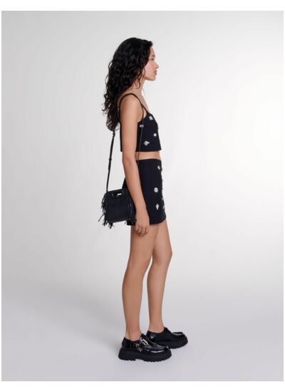 Avec quelles pièces associer ce short pour un look réussi ? Il se marie parfaitement avec des tops sobres ou des chemisiers fluides pour équilibrer son effet strass. Une paire de talons ou des bottines complètent l’ensemble pour une allure chic et moderne.