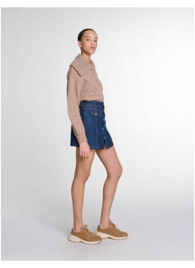 Chic et audacieuse, cette jupe courte en denim dévoile un short intégré en dessous. Réhaussée de deux poches à rabat et de surpiqûres effet plissé, elle se pare d'une fente boutonnée à l'avant pour un tombé évasé.