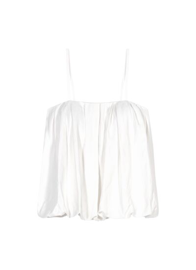 Jeux de volumes pour ce top réhaussé de plis et d'un effet boule sur le bas. Muni de bretelles fines à boutons ajustables, il cache un soutien-gorge intégré, et dévoile une broche amovible en forme de maxi nœud dans le dos.