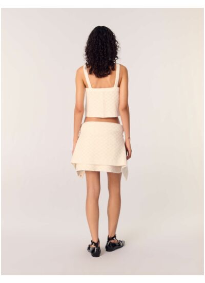 Ce top court est confectionné en maille cueillie effet tweed, une technique qui consiste à créer un léger effet de torsion, donnant l'apparence du tweed avec une structure solide et texturée. Ses larges bretelles et ses bords côtelés apportent une touche décontractée à son allure sophistiquée.