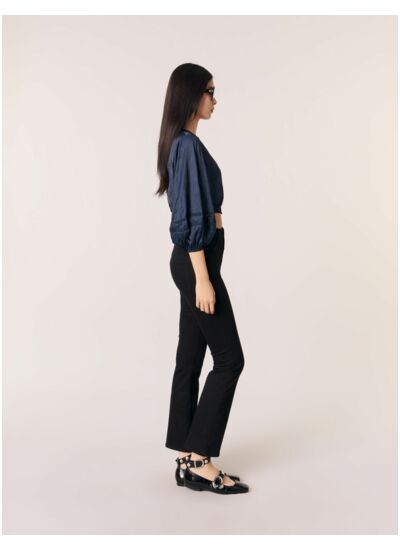 Ce top court satiné effet froissé arbore des manches 3/4 volumineuses, ornées de galons en dentelle ajourée. Délicatement smocké à la taille et ouvert au dos, il réinterprete la blouse classique avec modernité.