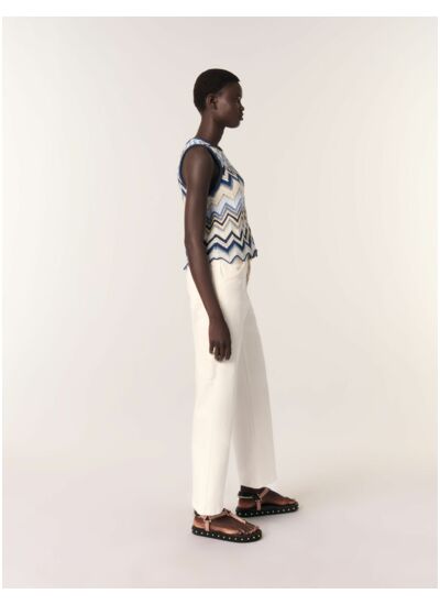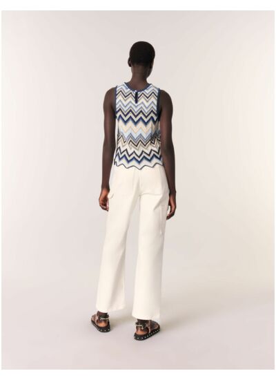 Ce top en maille crochet dévoile un motif zigzag géométrique à fils métallisés. Des emmanchures tressées et un bas festonné accentuent les bords avec élégance.