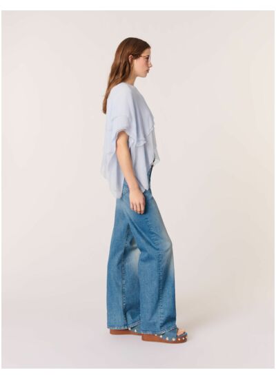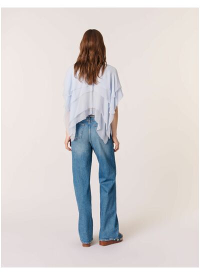 Coup de cœur du studio, ce top sans manches en mousseline offre un jeu de transparence et de volumes. Des pans et volants asymétriques créent un effet cape, à porter sur les épaules. Une ouverture goutte boutonnée au dos vient parfaire l'allure.